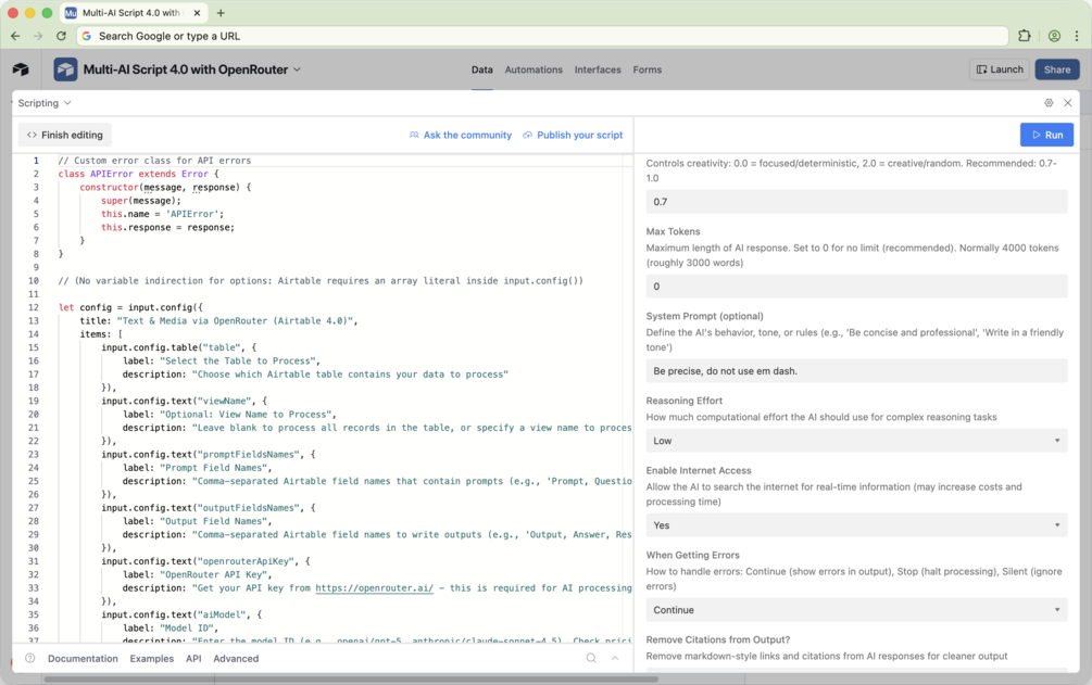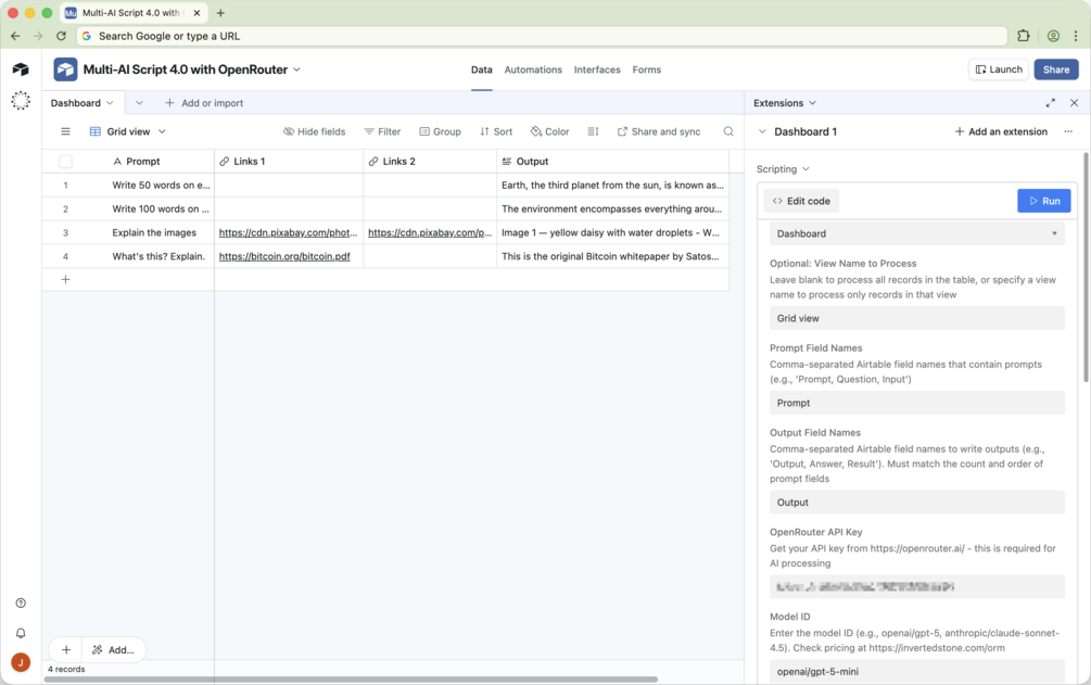 The Airtable script ($59) includes all text processing features with 300+ AI models, flexible URL detection with three modes (From Prompt Only, From Entire Record, or Disabled), multimodal support for text, images, and PDFs, web search integration, and comprehensive error handling. Unlike the Google Sheets version, it focuses on processing existing content rather than generating new images.